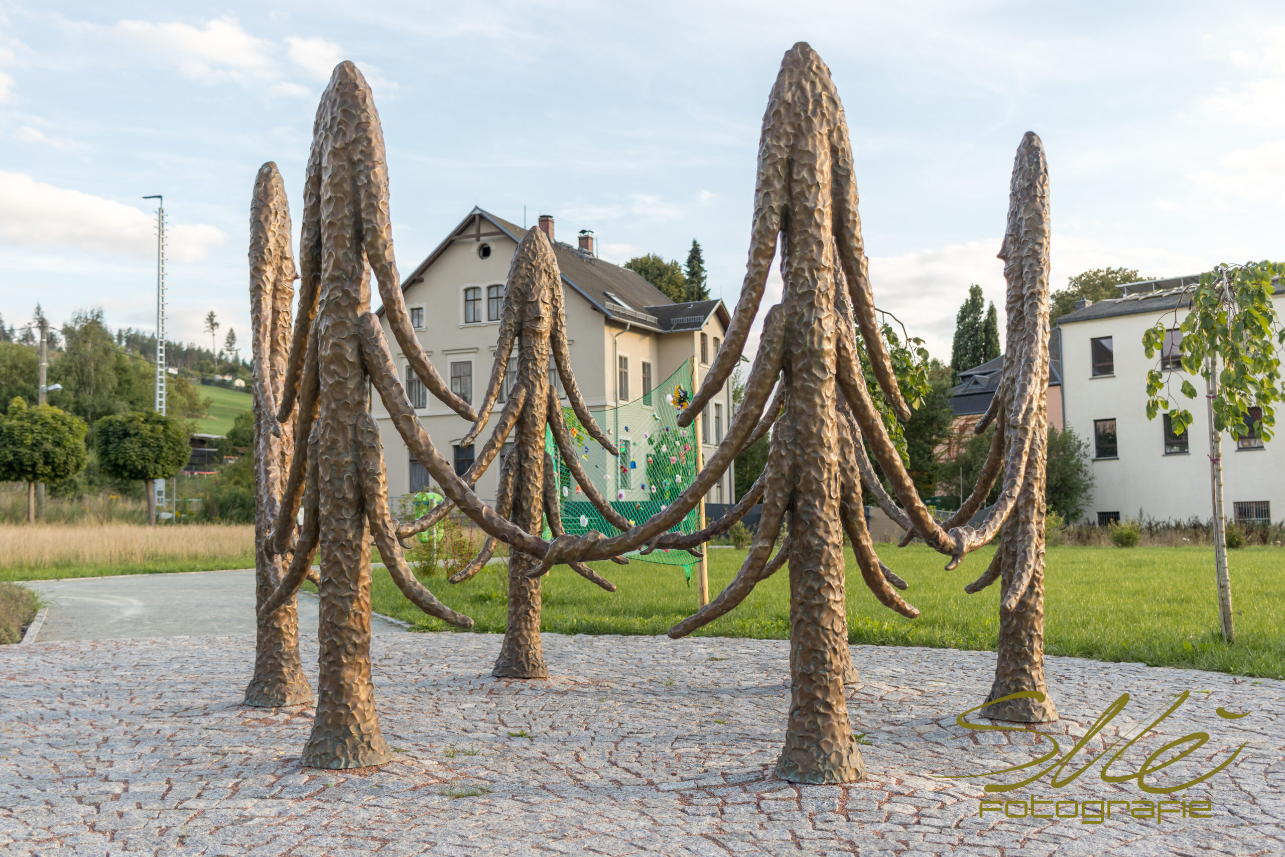 Platziert im Buntsockenpark, der Teil einer ehemaligen von Bruno Neukirchner erbauten Strumpf-Fabrik war, erinnert die Baumgruppe auch an das Konzept der forstlichen Nachhaltigkeit, das der sächsische Oberberghauptmann Hans Carl von Carlowitz 1713 in seinem Werk „Sylvicultura oeconomica“ beschreibt. Es besagt, dass dem Wald nur so viel Holz entnommen werden darf, wie nachwachsen kann. Doch heute herrscht Trauer über Millionen verdursteter Fichten, dem „Brotbaum“ der deutschen und sächsischen Forstwirtschaft. Die menschengemachte Klimakatastrophe konterkariert die vor gut 300 Jahren formulierte Nachhaltigkeits-Strategie.